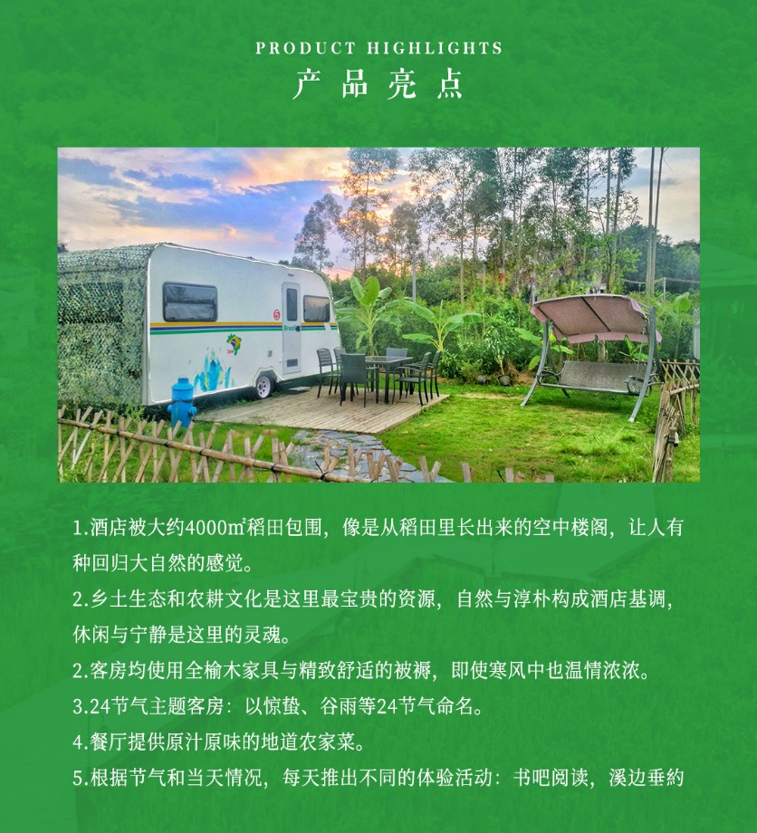 D1:出发→抵达民宿,办理入住→民宿内闲逛→下午茶→稻田拍摄→汉服体验拍摄→书吧阅读/江边垂钓/玩围棋→晚餐→露天电影或KTV→回房休息